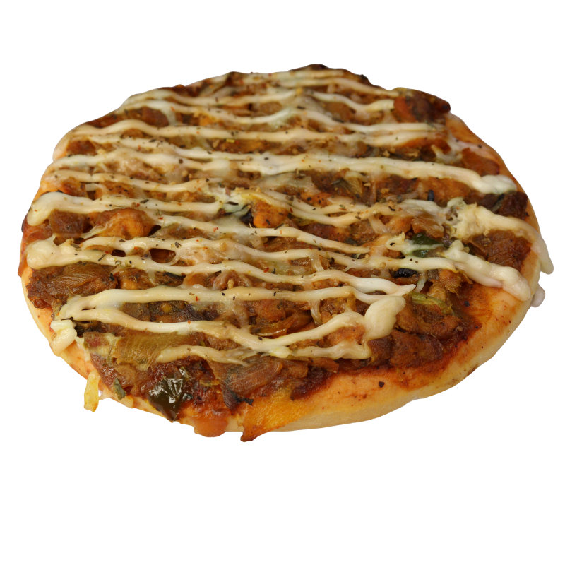 Pizza topped with mozzarella, spicy chicken tikka and Arabic sauce.