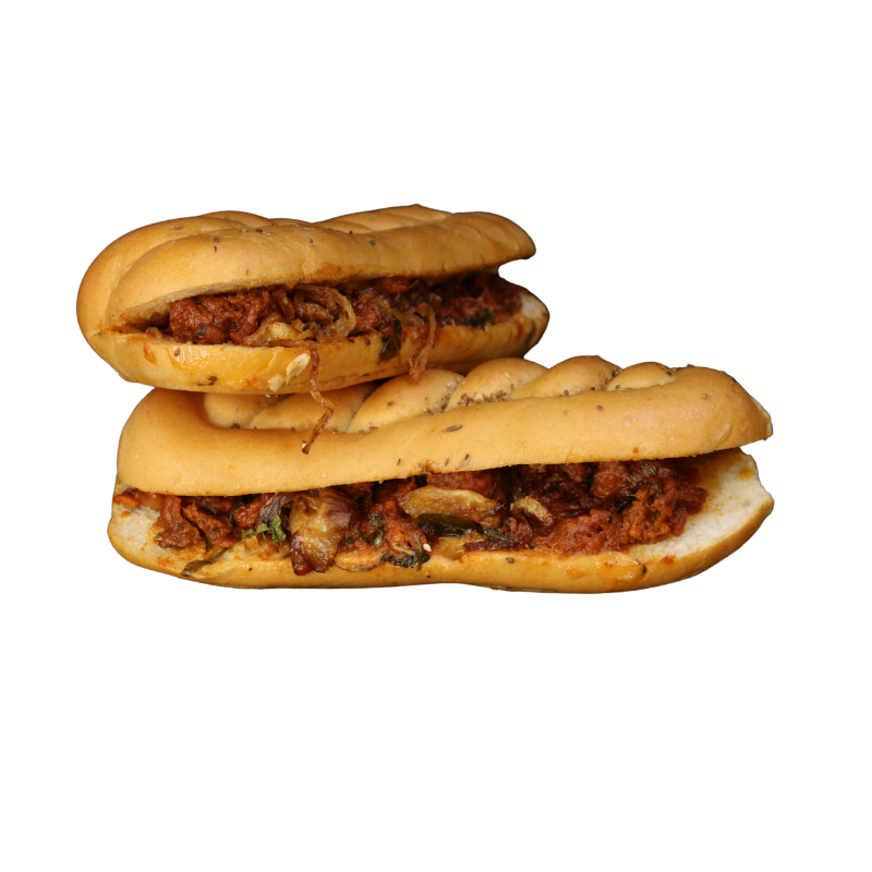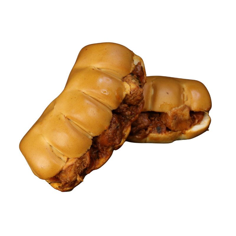 Boneless chicken strips with onion, garlic, and spices in a finger bun.